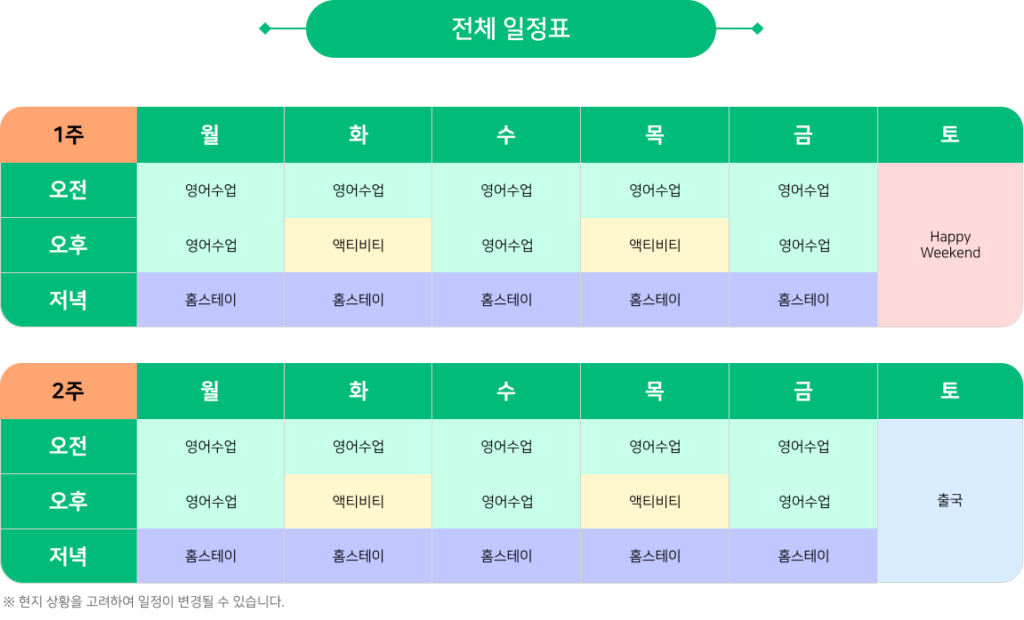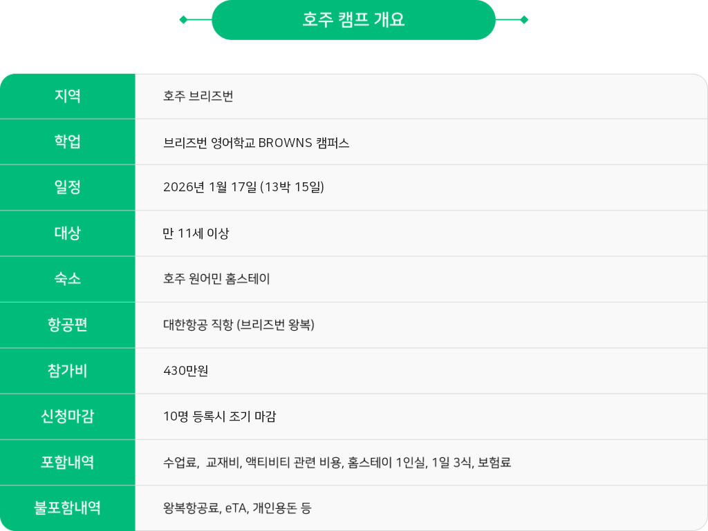 호주 캠프 김O혁 (중2) 수업은 재미있었고 주로 스피킹이랑 약했던 문법파트를 보강 할 수 있어서 매우 유익했다. 커리큘럼이 마음에 들었고 친구들을 많이 만들어서 정말 좋았다. 다 같이 함께 협동하고 재미있게 노는 액티비티들은 정말 유익하고 건강해지는 느낌을 받았다. 선생님들이 재미있으셔서 쉽게 참가하고 즐길 수 있었다. 지금까지 즐기거나 다녔던 캠프나 여행중에 이번 캠프가 가장 유익하고 재미있었다. 인솔자 선생님께서 신경 많이 써주셔서 너무 만족적이고 감사합니다. 선생님 감사합니다. 선생님 덕분에 캠프가 즐거웠던 O혁 올림